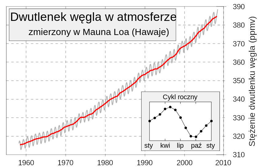 Dane pokazują systematyczny wzrost stężenia dwutlenku węgla w atmosferze od około 315 cząsteczek na milion objętościowo (ppmv) w 1958 do ponad 400 ppmv w 2017. Czyli o 21 % w ciągu 59 lat.